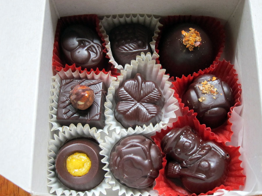 Their 2012 Valentine Truffle Collection includes flavors such as raspberry, blackberry, mint-to-be, burnin' love, and coconut cream--all crafted into beautiful hearts of different shapes. I especially like the blackberry: a beautifully dusted, oblong purple heart with a tart bite to it.